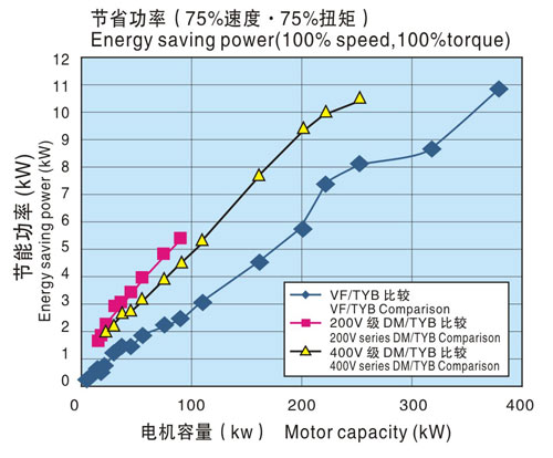 下圖是通過(TYB電機++INV)組合下的綜合效率與(感應電機(IM)+INV)、(直流電機(DM)+直流驅(qū)動裝置)的綜合效率之差來表示節(jié)省功率的。